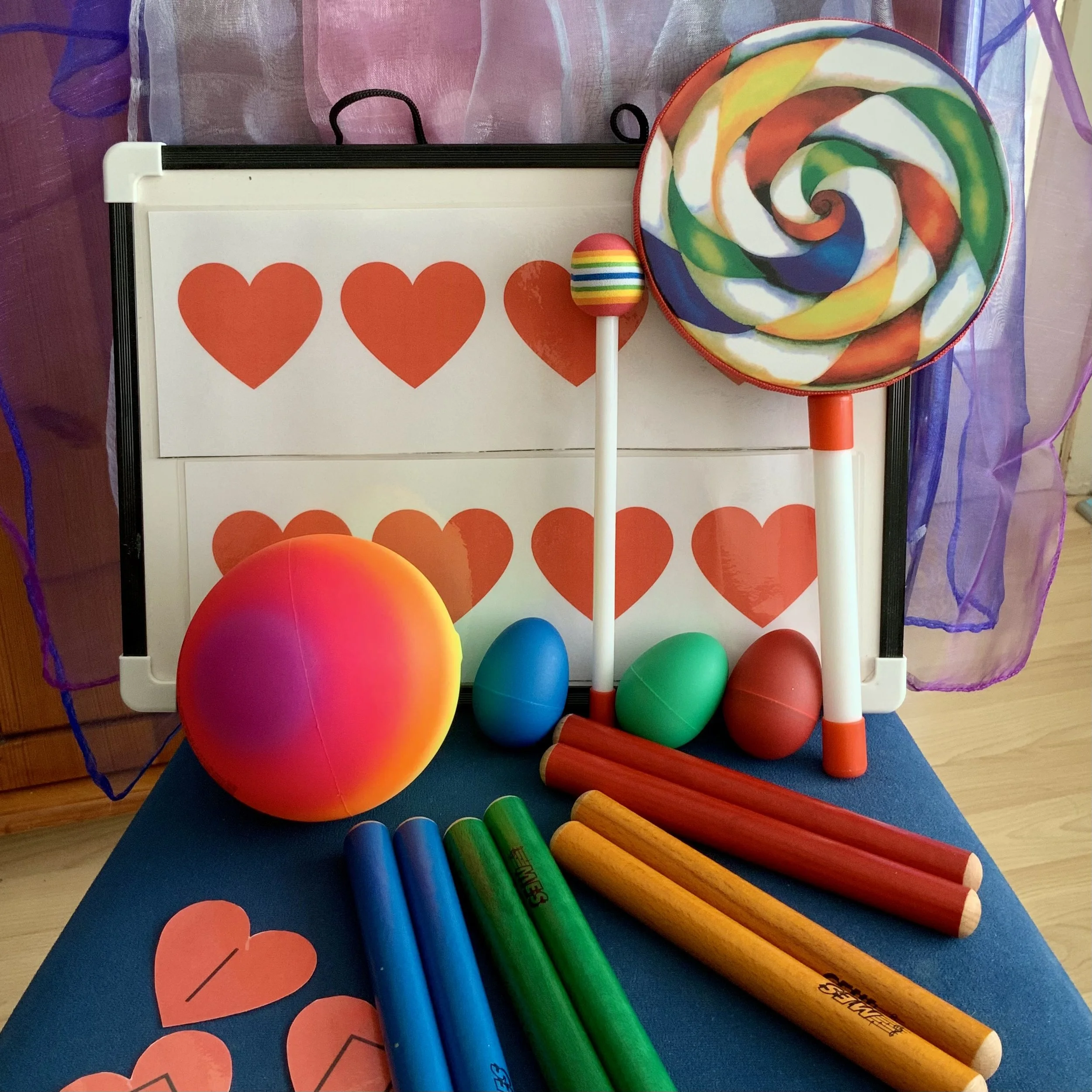 In this class we enjoy bonding with our child through songs and bouncing and tickling rhymes. As the children begin to walk they enjoy taking part in movement activities and circle dances. The children also develop their motor skills through using simple percussion instruments, puppets and parachutes. In this class we do a lot of tapping on our knees or tapping with the props or percussion to develop pulse (beat).